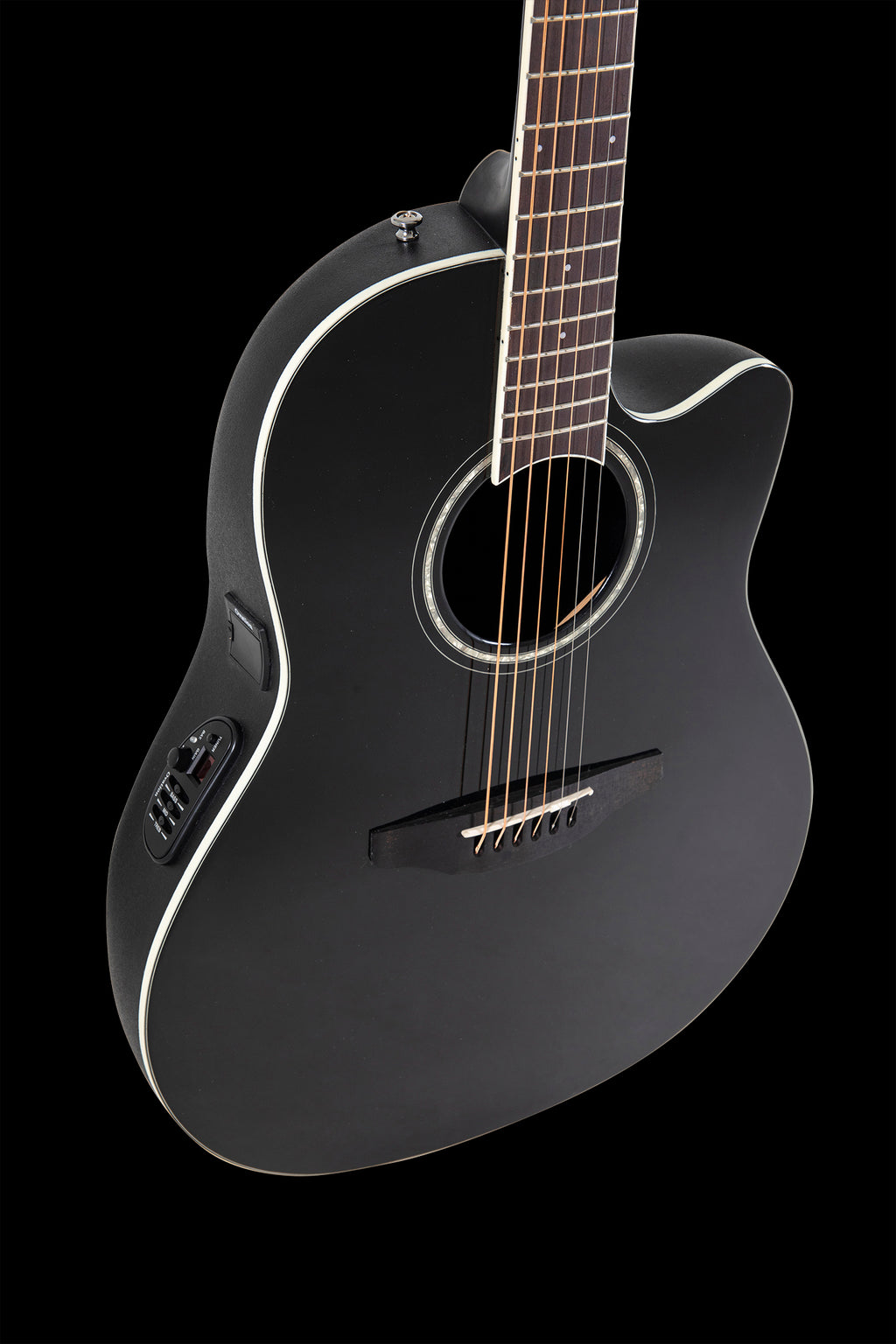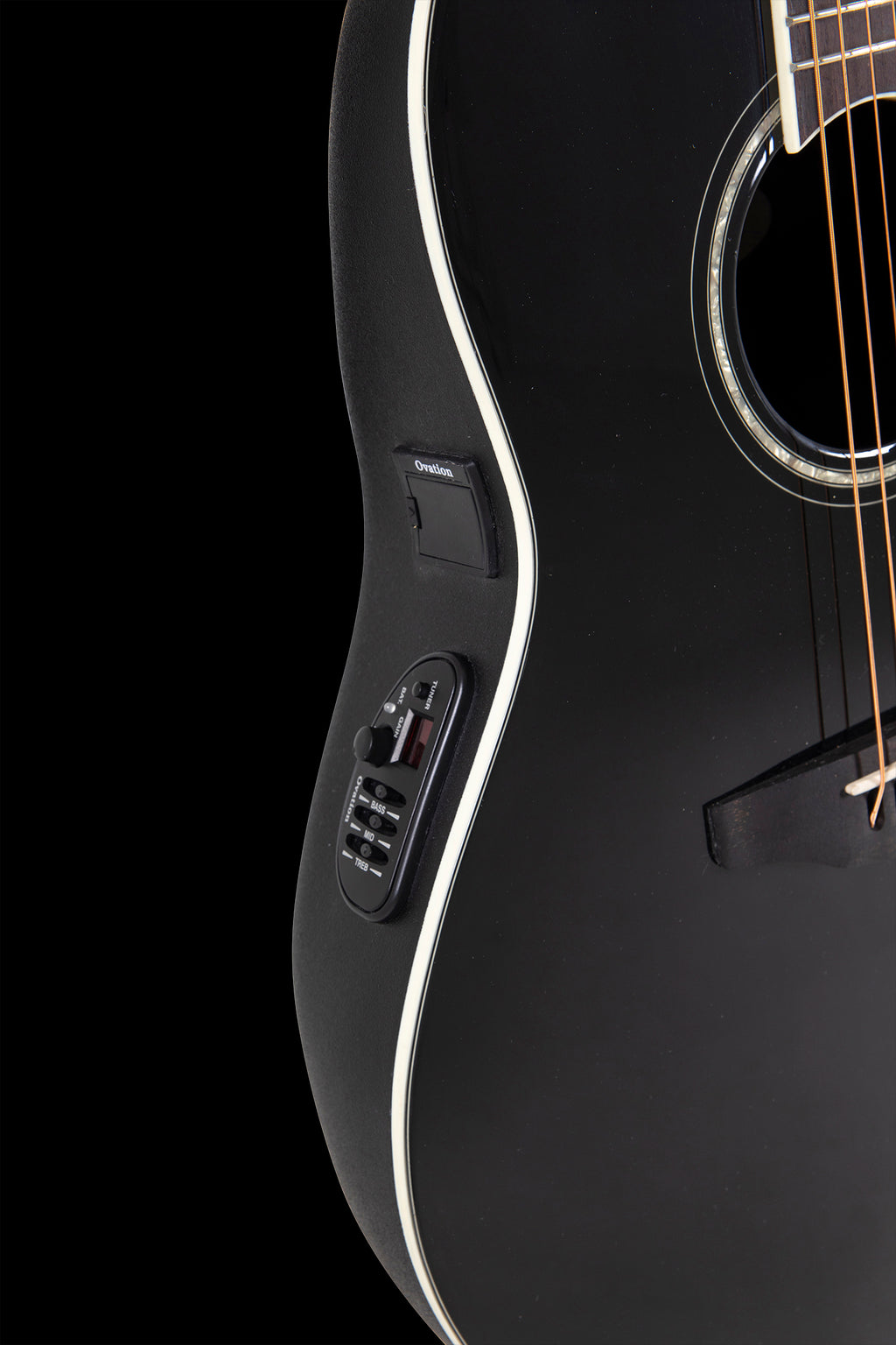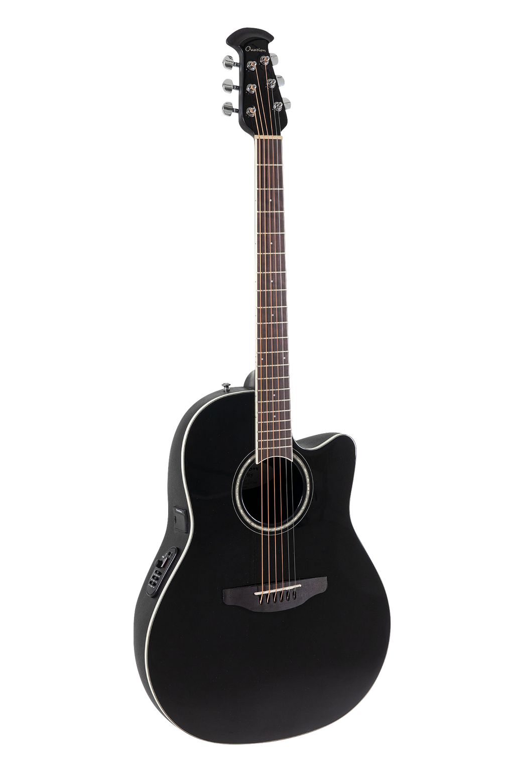 Marcadores y roseta con incrustaciones perladas Ribete del cuerpo en color marfil, ribeteado en varias partes Clavijero Die-Cast, cromado Pastilla Ovation CP-100 Slimline, preamplificador OP-4CT con afinador